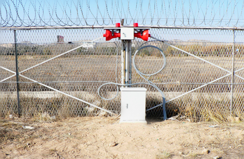 光纤入侵探测系统FD系列沿围栏周界上的铁丝网布防(垂直段与斜撑部分均进行布防)。当有人攀爬或剪切铁丝网,引起铁丝网的振动从而触发传感器,系统立即报警并向外输出报警信号。该系统被广泛应用在机场、军事基地及核电等大型周界防护,是被实践证明的一套可靠的周界报警系统。系统主要由多模传感光纤、报警处理器和防护套管等组成。