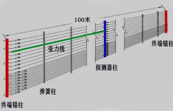 VTW-400电子张力围栏主要由探测器柱、端柱、弹簧柱、张力刺丝以及报警处理器组成,安装后可形成一个垂直加斜撑段面的探测墙体,当有入侵者拉动、踩踏、剪断或破坏任何一根拉紧的钢丝线,触发传感器产生报警。