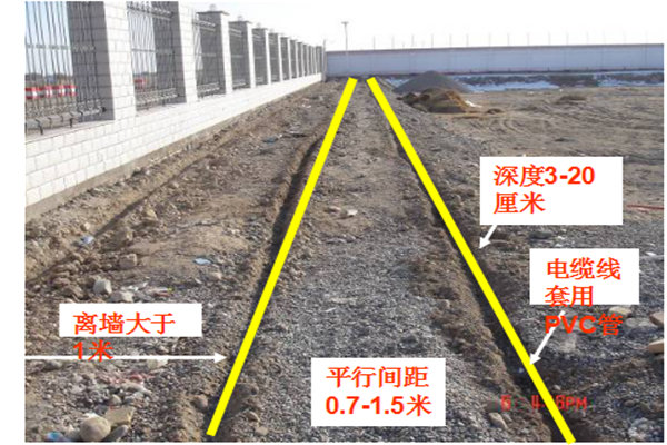 泄漏电缆为特制的同轴电缆,坚固耐用,安装条件无特殊要求。在各种土地、沥青、或混凝土等介质中都可以直接埋设,有效使用10年以上。一般埋设深度为5-20厘米,电缆间距1-1.5米。泄漏电缆可按地形轮廓任意布设,降低了施工成本,避免了探测死角和盲区。定位型泄漏电缆探测器适用于监狱、军事重地、机场、文物保管单位等要地周界防范。